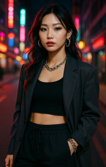 - 테토녀 스타일: 블랙 크롭탑 + 와이드 슬랙스 + 메탈 이어커프